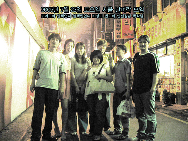 와우~~나 키크게 나왔당..ㅋ ((절대 다리 들고 찍은거 아님emoticon_002)) 제가 원래 막 시끄럽고 그런데 첨이라서 완전 뻘쭘 조용했지용...emoticon_012 그래서 친구만나서 벙개에서 못한 저의 행동을 취하며 술을 엄청 마셨드랬지여... 그결과 일요일에 장염이 걸려 고생을 했습니다..ㅜㅜ 기리형님, 민이형님, 발찍님, 비상님, 그외 2분(이름이 기억이 잘 안나서 죄송^^;) 즐거웠습니다. 담엔 이번 벙개와는 사뭇 다를테니 넘 놀라시지 마시구 행복한 일주일 보내세여~~^^ PS. 김남진은 음......살이 쏙 빠져서 광대뼈도 나오고 그럴때....달았다고...우웨웨~~~~푸힛