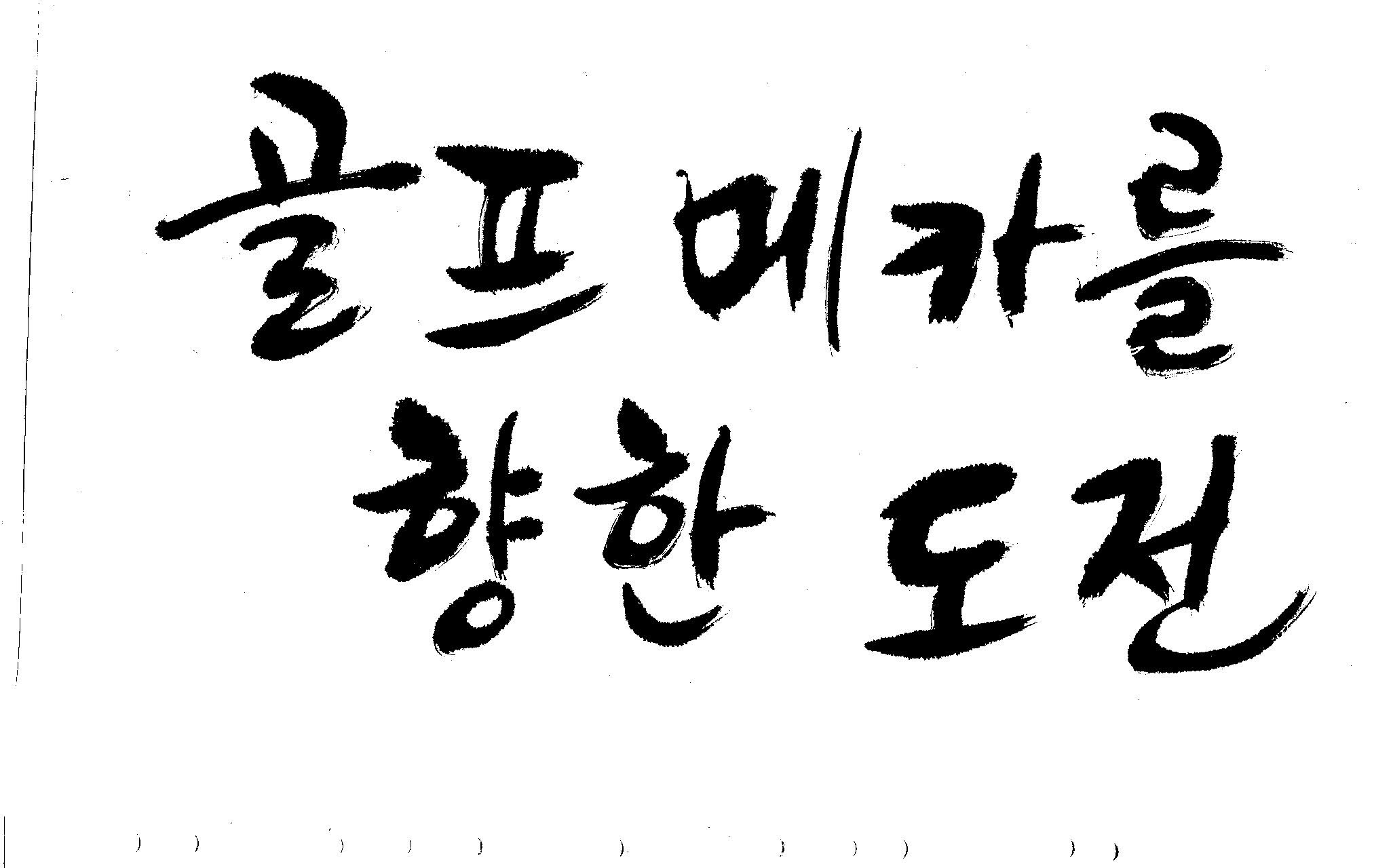 우경의 행복한 캘리세상-골프메카 김철호 일반 0 9400 2009.07.18 10:25 리듬감을 최대한 살리고 ㅡ 스포츠의 운동감과 밝음 기교섞인 획을 배제--일반적인 느낌 굵기변화를 통하여 도전 낱말을 강조 스타일은 비슷하지만 ...한 사람이 썼으니까 ㅎㅎㅎ 서로 다른 글꼴을 올린 것은... 비교하여 보시고... 편집자에게 선택권을 주는 것입니다